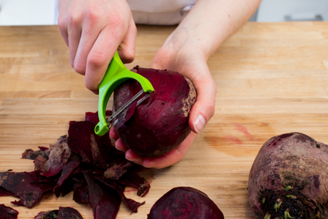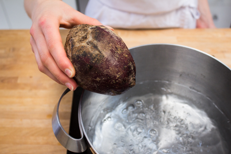 1. Dans une grande casserole d’eau bouillante salée, couvrir et cuire les betteraves jusqu’à ce que vous puissiez facilement les percer avec une fourchette, mais qu’elles soient encore fermes, pendant environ 25 à 30 minutes. Égouttez et laissez refroidir légèrement. Décollez la peau. Coupez-les en morceaux d’un pouce.