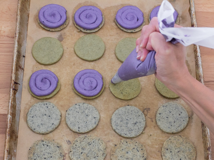 Biscuits à l’igname pourpre Biscuits à l’igname pourpre Halloween est un festin pour tous les sens, ces biscuits ciblent particulièrement la vue et le goût. Petits et grands seront conquis par les couleurs étonnantes des biscuits et l'incroyable glaçage violet! Mieux encore, les colorants sont tous naturels, provenant de graines de sésame noires, de thé matcha et d’igname pourpre. Ils sont si beaux (et délicieux), c'est effrayant! Categories: biscuits pour le thé Biscuits, brownies et barres Desserts collation de l'après-midi Pause-Café collation matinale Halloween RENDEMENT 32 biscuits TEMPS DE PRÉPARATION 30 minutes TEMPS DE CUISSON 8 à 10 minutes INGRÉDIENTS Pour les biscuits 2 ⅓ tasses (292 g) de farine tout usage ½ c. à thé (3 g) de sel ¼ c. à thé (1 g) de poudre à pâte ¾ tasse (170 g) de beurre non salé, température pièce ¾ tasse + 2 c. à soupe (175 g) de Sucre Granulé Redpath® 1 œuf de calibre gros 2 c. à thé (10 ml) d’extrait de vanille pure 4 c. à thé (6 g) de poudre matcha 2 c. à table (19 g) de graines de sésame noires, légèrement grillées et moulues 1 c. à table (9 g) de graines de sésame noires, légèrement grillées Pour le glaçage à l’igname pourpre ¾ tasse (170 g) de beurre 2 ⅔ tasses (320 g) de Sucre à Glacer Redpath® ¾ c. à thé (5 g) de sel 1 c. à table (15 ml) d’arôme d’igname pourpre Méthode Pour les biscuits: Préchauffer le four à 350 °F (175 °C). Tapisser deux plaques à pâtisserie de papier parchemin. Dans un bol moyen, fouetter ensemble la farine, le sel et la poudre à pâte jusqu'à ce que tout soit bien mélangé. Réserver. Dans le bol d'un batteur sur socle muni du batteur plat, crémer le beurre en incorporant le Sucre Granulé Redpath® à vitesse moyenne jusqu'à l’obtention d’une consistance légère et d’une couleur pâle, soit environ 3 minutes. Ajouter l'œuf et l'extrait de vanille. Mélanger jusqu'à ce que l'œuf et l'extrait de vanille soient complètement incorporés à la pâte. À basse vitesse, ajouter environ la moitié du mélange sec au bol et à peine combiner. Ajouter le reste de la farine. Mélanger jusqu'à ce qu'une pâte se forme ; ne pas trop mélanger. Diviser la pâte en deux. Sur une moitié, saupoudrer la poudre de thé vert matcha. Pétrir délicatement pour combiner. Sur l'autre moitié, saupoudrer les graines de sésame noires moulues et les graines de sésame noires entières. Emballer chaque pâte colorée dans une pellicule de plastique et réfrigérer au moins 30 minutes. Lorsque vous êtes prêt à utiliser la pâte, la sortir et laisser tempérer, soit environ 5 minutes. Placer la pâte matcha entre deux feuilles de papier parchemin. Abaisser la pâte à ¼ de pouce (6 mm) d'épaisseur. À l'aide d'un emporte-pièce de 2 pouces de diamètre, découper des ronds. Les retailles peuvent être regroupées, abaissées et découpées de nouveau. Répéter l'opération avec la pâte au sésame noir. Déposer les biscuits sur la plaque à pâtisserie préparée. Placer les biscuits au réfrigérateur ou au congélateur pour les refroidir avant la cuisson, soit environ 10 minutes. Mettre les biscuits au four préchauffé et cuire pendant 10 à 12 minutes. Retirer du four. Refroidir 5 minutes sur la plaque à pâtisserie. Transférer à une grille pour refroidir complètement. Pour le glaçage à l’igname pourpre[: Dans le bol d'un batteur sur socle muni du batteur plat, crémer le beurre jusqu’à l’obtention d’une texture lisse, soit environ 2 minutes. Incorporer le Sucre à Glacer Redpath® et le sel en tamisant. Mélanger jusqu'à ce que le sucre soit incorporé dans le beurre. Ajouter l’arôme d’igname pourpre et battre le mélange à vitesse moyenne-élevée jusqu'à consistance légère. Transférer le glaçage dans une poche à douille équipée d'une fine pointe. Déposer environ une cuillère à soupe de glaçage sur la moitié des dessous de chacune des deux saveurs de biscuit. Couvrir soit avec le même ou avec l’autre saveur de biscuit. Entreposer les biscuits entre des couches de papier parchemin dans un contenant hermétique. Ils se conservent à température ambiante jusqu'à une semaine ou jusqu'à deux mois au congélateur. Conseils du chef Pour créer une surface plane pour la décoration, lisser immédiatement le dessus de chaque biscuit à l'aide d'un façonneur à fondant lorsque les biscuits sortent du four. L’arôme d’igname pourpre se trouve dans certains magasins en vrac, dans les magasins de décoration de gâteau et dans les supermarchés asiatiques. Les graines de sésame noires grillées peuvent être moulues à l'aide d'un moulin à épices ou d’un mortier et pilon.