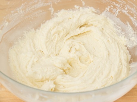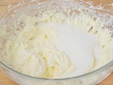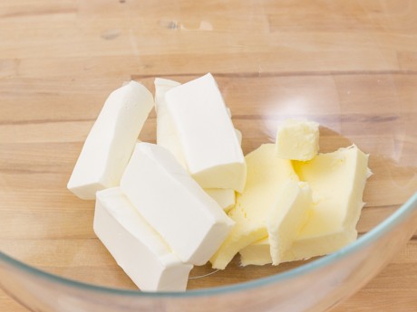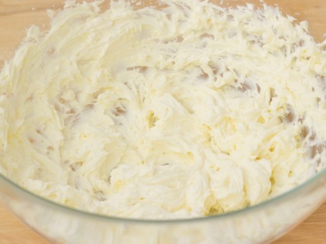 2. Crémer le beurre et le fromage à la crème à l'aide d'un mélangeur électrique à main ou d'un batteur sur socle munit du fouet plat. Ajouter tranquillement le sucre et continuer à mélanger jusqu'à consistance mousseuse et homogène.