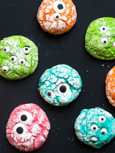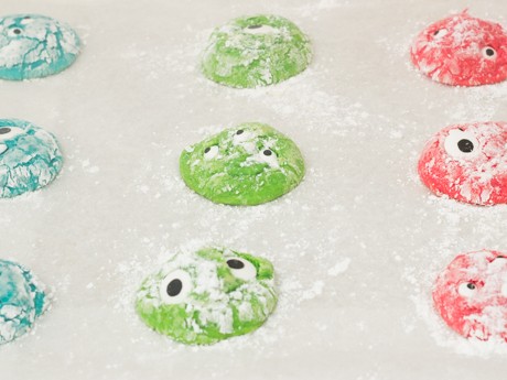 8. Cuire au four pendant 12 minutes. Retirer du four et délicatement enfoncer les yeux en bonbons dans les biscuits encore chauds. Laisser tempérer.