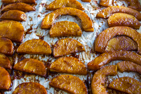 Placer les morceaux de courge sur la plaque tapissée de papier parchemin. Laisser un espace entre chaque morceau afin de s’assurer qu’ils cuisent uniformément.