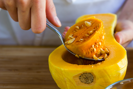 La courge est un légume typiquemment automnal, qu'on aime bien préparer pour le festin de l'Action de grce. L'odeur de la courge rôtie et de ses épices est tellement appétissante, vos amis et votre famille se dépêcheront de se mettre à table pour y goûter. Nous avons utilisé la courge butternut pour cette recette, mais toute autre courge de votre choix fait l'affaire.