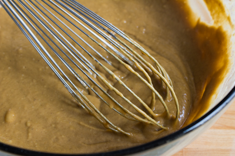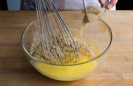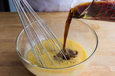 Dans un autre bol, battre ensemble l’huile, la mélasse, la cassonade, les œufs et la bière noire.