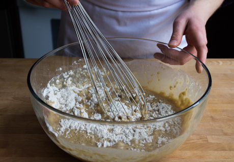 Ajouter graduellement le mélange de farine aux ingrédients humides et mélanger.