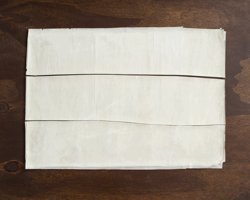 Ne travailler qu’avec une feuille de pâte phyllo à la fois en gardant le reste couvert. Badigeonner la feuille de beurre fondu. Placer une autre feuille directement dessus, la badigeonner de beurre et recouvrir d'une troisième feuille de pâte phyllo. À l'aide d'un couteau bien aiguisé, découper la pâte en 12 carrés égaux.