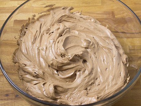 Ajouter 1 tasse (132 grammes) de crème au beurre au chocolat fondu pour le détendre et fouetter. Ajouter le chocolat fondu dans la crème au beurre en pliant.