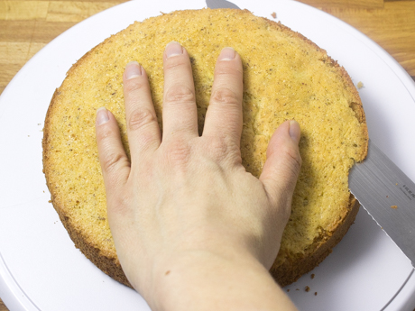 Retirer la partie bombée des gâteaux à l’aide d’un couteau dentelé.