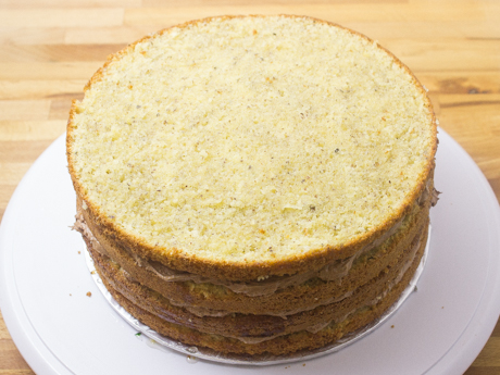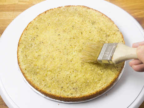 Couper chaque gâteau horizontalement en deux parties égales. Transférer un étage de gâteau sur un plateau à gâteau le côté coupé vers le haut. Badigeonner généreusement du sirop de vanille.