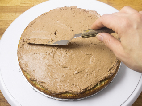 Étendre environ ¾ tasse (99 grammes) de la crème au beurre au chocolat et égaliser à l’aide d’une spatule à angle. Déposer un autre étage de gâteau par-dessus.