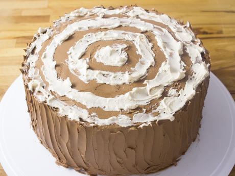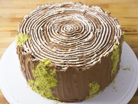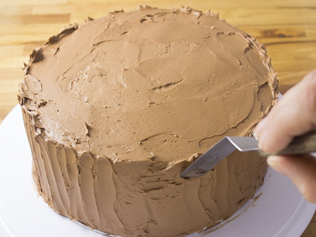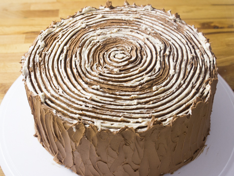 Utiliser une spatule à angle ou un couteau à beurre afin de créer un effet d’écorce sur les côtés du gâteau.