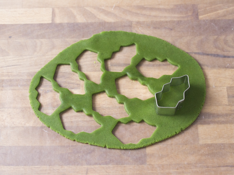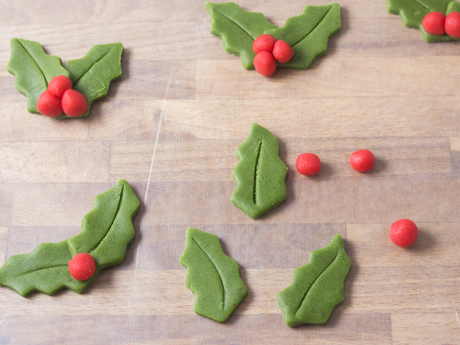 Colorer 3 cuillères à table (75 grammes) de massepain avec le colorant en gel vert. Rouler à une épaisseur de ¼ pouce (6 millimètres) entre deux feuilles de papier ciré. Découper des feuilles.