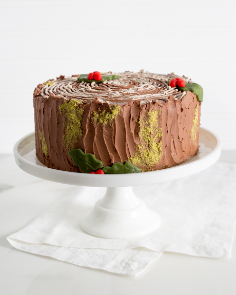 Pour créer les cernes de la souche d’arbre sur le dessus, étendre grossièrement la crème au beurre nature réservée en formant des cercles.
