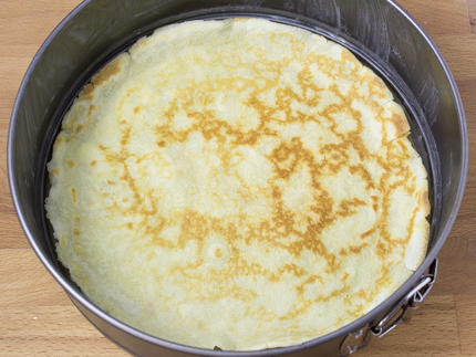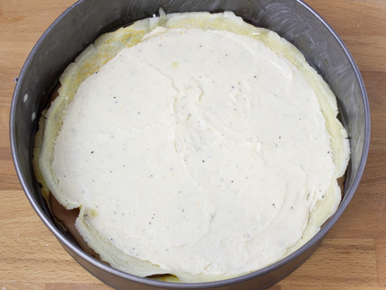 Déposer une autre crêpe et couvrir d’environ ½ tasse (120 millilitres) de la sauce au fromage.