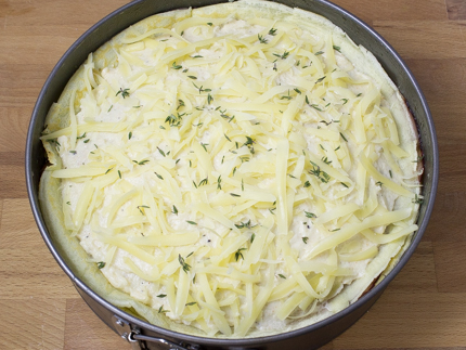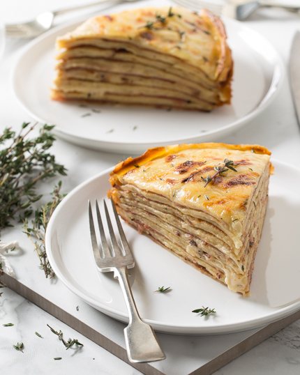 Répéter avec le reste des crêpes et terminer avec le fromage réservé et les feuilles de thym.