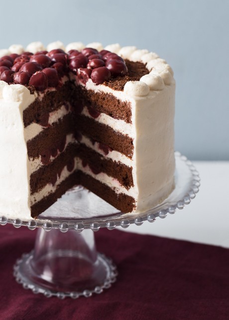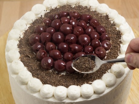12. Mettre les cerises au centre du gâteau. Faire des points ou des rosettes à l’aide de la crème fouettée restante. Faire des copeaux de chocolat à l’aide d’un économe et déposer à l’aide d’une cuillère entre les cerises et la crème fouettée. Laisser durcir au réfrigérateur au moins 30 minutes ou préférablement plusieurs heures afin que les saveurs se développent et que la crème fouettée fige.