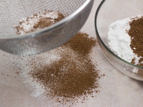 2. Dans un bol moyen, combiner la farine, le cacao et le sel. Tamiser les ingrédients sur une feuille de papier parchemin et réserver.