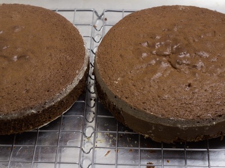 7. Laisser tempérer dans les moules pedant 10 minutes. Démouler à l’aide d’un couteau ou d’une spatule à glacer et laisser tempérer complètement sur une grille le beau côté vers le haut. Pendant que les gâteaux tempèrent, préparer le sirop de cerises et la crème fouetté stabilisée.