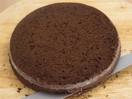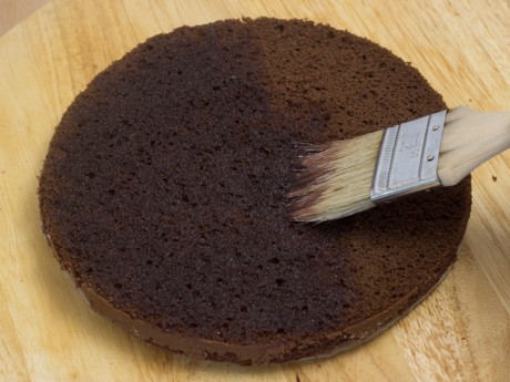8. À l’aide d’un couteau dentelé, couper la partie ronde du dessus du gâteau puis couper en deux au centre afin d’obtenir quatre gâteaux. Mettre la moitié de la crème fouettée dans une poche à pâtisserie munit d’une douille ronde. Mettre un gâteau sur un plateau tournant ou sur une assiette de service. À l’aide d’un pinceau, badigeonner généreusement du sirop de cerises.