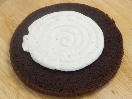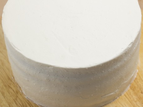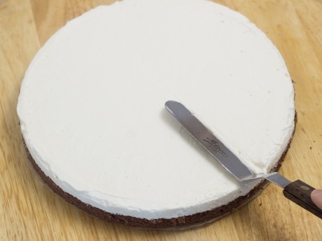 11. Étendre une fine couche de crème fouetté sur le gâteau (c’est ce qu’on appelle la “crumb coat”). Mettre au réfrigérateur pendant 15 minutes. Étendre uniformément le reste de la crème fouettée sur le dessus et les côtés. Réserver un peu de crème fouettée pour décorer le dessus du gâteau.