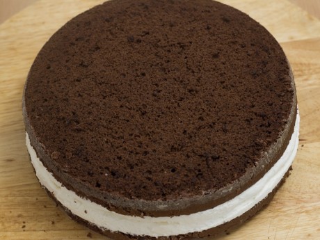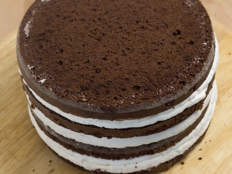 10. Déposer la deuxième couche de gâteau par-dessus, appuyer légèrement et répéter la même opération avec la crème fouettée et les cerises. Faire la même chose avec les deux autres couches de gâteaux.