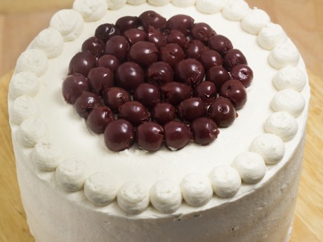 9. En partant du centre, appliquer la crème fouettée en faisant une spirale. Lisser à l’aide d’une spatule à glacer. Appliquer un anneau de crème fouettée supplémentaire à la limite du gâteau afin que les cerises ne tombent pas. Ajouter quelques cerises à l’intérieur de l’anneau.