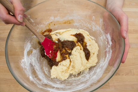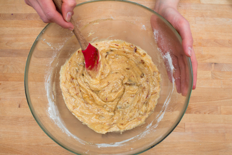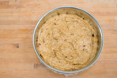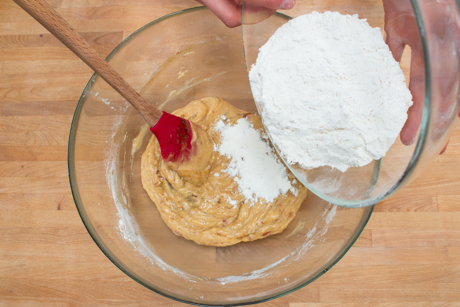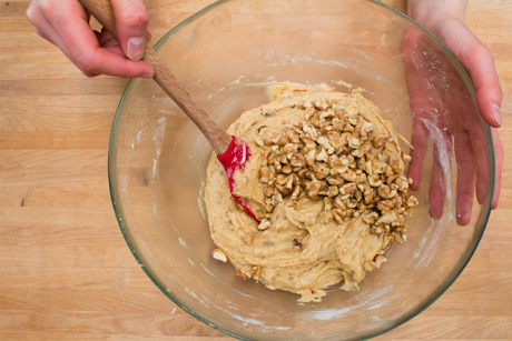 5. Commencez à ajouter les ingrédients secs en alternant avec le mélange de dattes chaud, en commençant et en terminant avec le sec. Mélangez bien après chaque addition. Incorporez les noix.