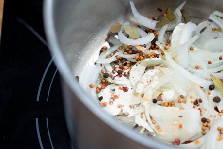 1. Dans une grande casserole sur feu doux placer votre oignon coupé en dés, les épices à marinade et l’ail. Faire revenir les ingrédients pendant 5-10 minutes en remuant de temps en temps pour s’assurer que l’oignon et l’ail ne brunissent pas.