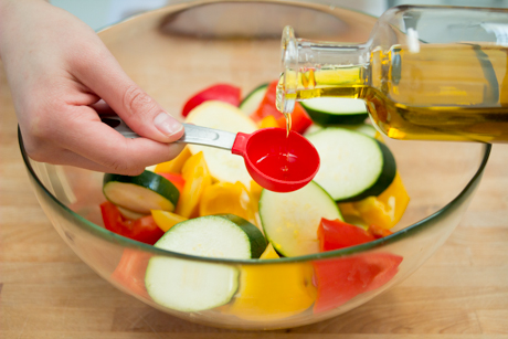 4. Arrosez les légumes avec l’huile d’olive extra vierge, puis mélangez pour qu’ils soient tous enrobés. Il est préférable d’utiliser un grand bol pour cette étape puisque cela vous donnera de la place pour mélanger les légumes, sans faire de dégâts.