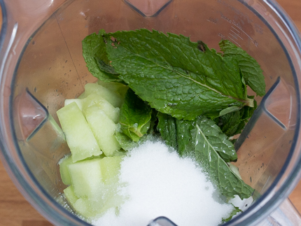 Ajouter ⅓ de tasse (66 grammes) de sucre granulé Redpath®, le melon, le jus de citron vert, le rhum et les feuilles de menthe dans le mélangeur.