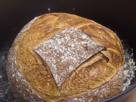 Mettre la cocote au four avec le couvercle et cuire pendant 10 minutes. Réduire la température à 400℉ (200℃) et poursuivre la cuisson pendant 10 minutes. Retirer le couvercle et cuire de 15 à 25 minutes ou jusqu'à ce que la température au centre indique 212℉ (100℃). La croûte devrait être dorée foncée et émettre un son creux lorsque tapée. Le pain devrait être léger pour sa taille.