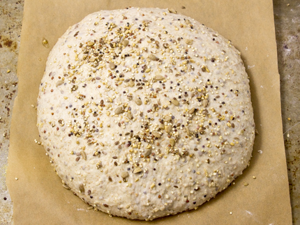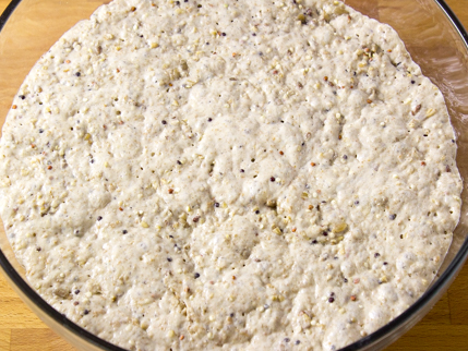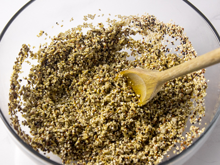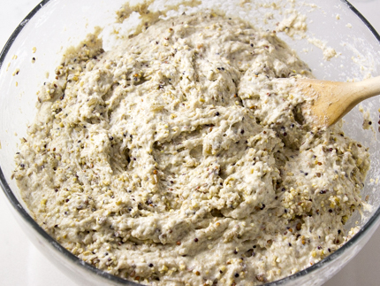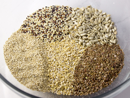 Faire bouillir ½ tasse (120 ml) d’eau. Mettre le quinoa, l’avoine épointée, les graines de lin, de tournesol et de sésame dans un grand bol et mélanger. Réserver 2 c. à table du mélange pour saupoudrer sur le pain. Verser l’eau bouillante par-dessus et remuer. Couvrir d’une pellicule de plastique et laisser reposer une heure.