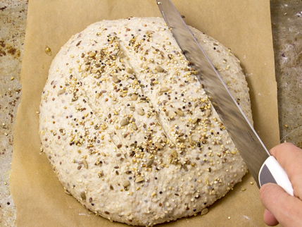 Tracer trois lignes d’environ ¼ po de profondeur sur le dessus de chaque pain à l’aide d’un couteau dentelé.