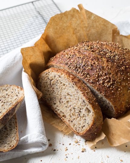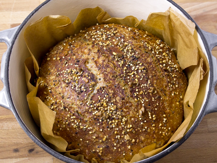 *Vous pouvez aussi cuire ce pain dans une poêle en fonte. Préchauffer le four à 220˚C (425˚F). Mettre un moule rond en métal dans le bas du four ainsi que la poêle et faire chauffer pendant 30 minutes. Faire bouillir de l’eau et verser dans le moule rond. Mettre le pain dans la poêle avec le papier parchemin et cuire pendant 45 minutes ou jusqu’à ce que le pain soit bien doré et que la température au centre soit de 93˚C (200˚F).