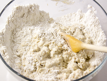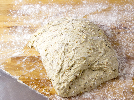 Transférer la pâte sur une surface légèrement farinée à l’aide d’un coupe-pâte ou d’une spatule en caoutchouc (la pâte sera humide).