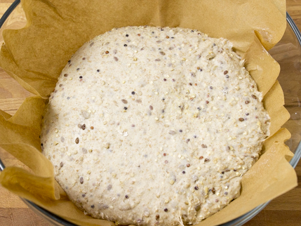 Transférer dans un gros bol graissé, couvrir d’une pellicule de plastique et laisser doubler de volume à température pièce, de 14 à 18 heures.