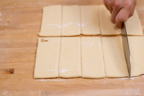 12. En travaillant avec un morceau à la fois , roulez sur une surface légèrement farinée en un rectangle de 12x6 pouces.