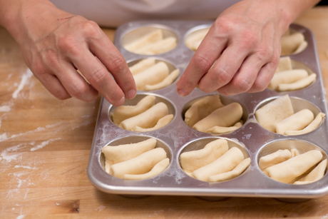 15. Placez la pâte pliée dans la cavité d'un muffin , et badigeonner légèrement le dessus de beurre fondu.