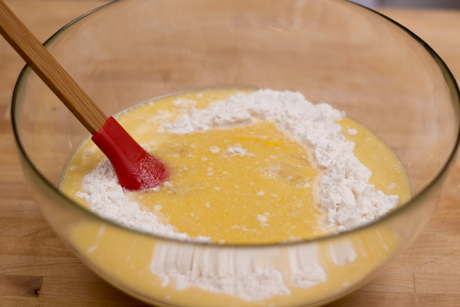 6. Ajoutez 3 1/2 tasses de farine tout usage dans les ingrédients humides et mélangez vigoureusement avec une cuillère en bois ,jusqu'à obtention d'une pâte rugueuse.