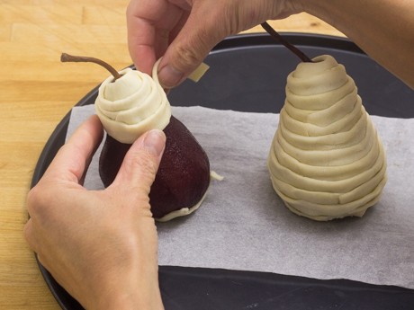 3. En partant du haut près de la tige, envelopper la poire de bandelettes de pâte feuilletée de façon à la recouvrir complètement. Chaque bandelette se chevauchera. Une fois la première bandelette terminée, continuer avec une autre en humidifiant les extrémités pour bien les sceller ensemble. Déposer la poire sur une plaque à biscuits recouverte d’un papier parchemin et répéter avec l’autre poire.