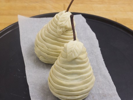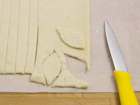 4. Couper deux feuilles à l’aide d’un couteau coupant dans la pâte feuilletée restante. Tracer les nervures à l’aide de la pointe du couteau. Badigeonner un peu d’eau sous la feuille et attacher délicatement sur le dessus la poire près de la tige.
