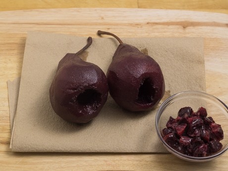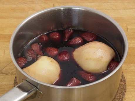 6. Filtrer le liquide et jeter la gousse de vanille et les bâtons de cannelle. Couper les fraises pochées en dés et remplir la cavité des poires. Remettre l’excédant de fraises dans le liquide. Elles ajouteront de la saveur à la réduction.