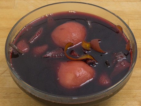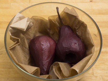 4. Transférer les poires dans un bol et verser le liquide par-dessus. Laisser tempérer complètement pendant environ deux heures.