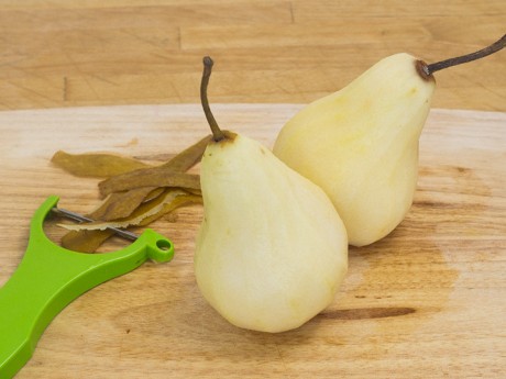 2. Préparer les poires pendant ce temps. À l'aide d'un vide-pomme, retirer le coeur de la poire en partant du bas jusqu'au milieu de la poire et assurez-vous qu'il n'y ait plus de pépins. Utiliser une petite cuillère au besoin pour retirer les pépins. Laisser la tige intacte.