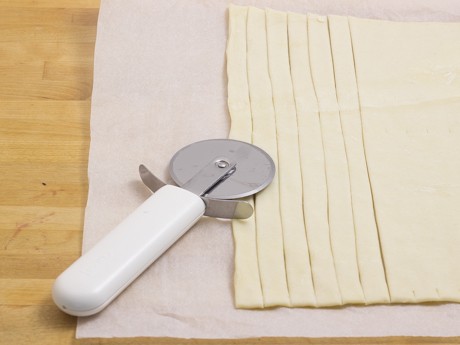 1. Rouler la pâte feuilletée en un carré de 10 pouces (25 centimètres) et couper des bandelettes de ½ pouce (1.3 centimètre) de largeur. Vous aurez besoin de six à sept bandelettes pour couvrir chaque poire. Couper deux carrés de 1.5 pouces (4 centimètres) de la pâte feuilletée.