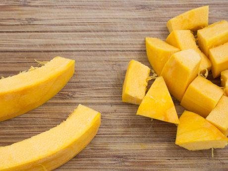 Couper la citrouille en deux et vider l’intérieur. Enlever la pelure et couper en cubes de ¾ pouce (2 centimètres).