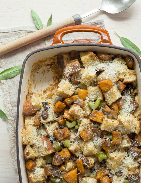Transférer les champignons avec le reste des légumes cuits. Ajouter les cubes de citrouille, les morceaux de pain et une tasse (62 grammes) du fromage parmesan. Bien enrober et transférer dans le plat allant au four.