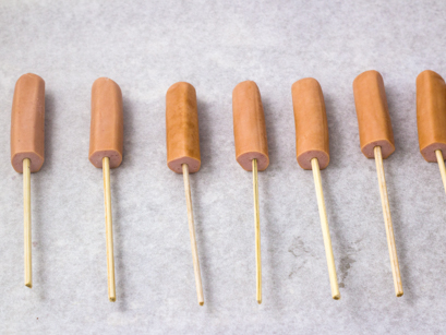Saucisses au poulet sur bâtonnet Saucisses au poulet sur bâtonnet Les saucisses sur bâtonnet font partie de l’enfance de plusieurs générations et pourtant, l’origine de ce délicieux snack est encore inconnue. Cette version au four et à base de saucisses au poulet se prépare en moins de 30 minutes. Categories: Plats salés et salades Dîners collation de l'après-midi RENDEMENT 14 saucisses au poulet sur bâton TEMPS DE PRÉPARATION 15 minutes TEMPS DE CUISSON 15 à 20 minutes INGRÉDIENTS 1 tasse (130 g) de farine tout usage 1 tasse (157 g) de semoule de maïs jaune 1 c. à thé (5 g) de poudre à pâte ¼ tasse (50 g) de Cassonade Foncée Redpath® ½ c. à thé (4 g) de sel ½ c. à thé (1 g) de moutarde sèche 6 c. à table (85 g) de beurre ½ tasse (118 ml) de lait 7 saucisses à hot-dog au poulet 14 bâtons de bois de 6 po (15 cm) moutarde, ketchup ou trempette chipotle au service Cassonade Foncée Méthode 1. Préchauffer le four à 400℉ (204℃). Couvrir une plaque à biscuits de papier parchemin et réserver. 2. Dans un grand bol, fouetter la farine, la semoule de maïs jaune, la poudre à pâte, la Cassonade Foncée Redpath®, le sel et la moutarde sèche. Ajouter le beurre et incorporer à l’aide d’un coupe-pâte ou de deux fourchettes jusqu’à l’obtention d’une chapelure grossière. Ajouter le lait et bien mélanger à l’aide d’une cuillère en bois ou de vos mains 3. Couper la saucisses en deux dans le milieu et insérer un bâton de bois jusqu’à la moitié de la saucisse. 4. À l’aide d’une cuillère à crème glacée ou d’une grosse cuillère, former une boule et enrober la saucisse en prenant soin de la recouvrir complètement en insistant aux extrémités. Déposer sur la plaque et répéter. 5. Cuire pendant 10 minutes, retourner délicatement les bâtonnets et poursuivre la cuisson pendant 10 minutes. Si la couleur devient dorée rapidement, réduire le temps de cuisson total à 15 minutes. Conseils du chef Vous pouvez congeler les saucisses au poulet sur bâtonnets. Simplement les décongeler avant de les faire cuire.
