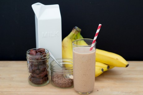 3. Combiner ½ tasse (118g) du mélange de dattes avec la banane, les graines de lin, le beurre d’arachides et la cannelle dans un mélangeur.