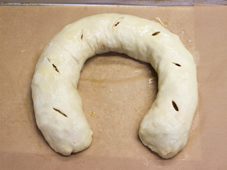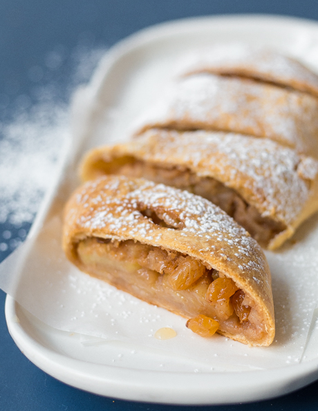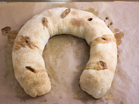 Placer la plaque à cuisson préparée à côté du strudel roulé et utiliser le linge pour le transférer sur la plaque, jointure vers le bas. Incurver le strudel s’il est trop grand pour la plaque.