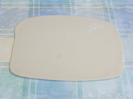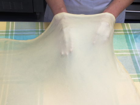 Rouler la pâte pour former un rectangle d’environ 12 par 14 pouces (30.5 x 35.5 centimètres). Soulever la pâte d’un côté et laisser le poids de la pâte l’étirer. Passer au côté suivant et étirer chaque côté jusqu’à ce que la pâte soit trop grande pour être manipulée.